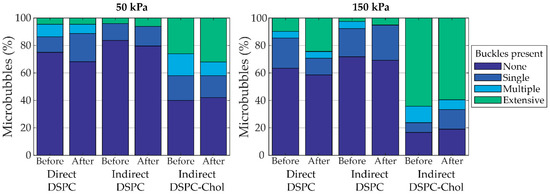 Percentage of microbubbles with buckles (none, single, multiple, or extensive) before and after insonification at 50 kPa (left panel) and 150 kPa (right panel). Indirect DSPC-cholesterol microbubbles contained 12 mol% cholesterol.