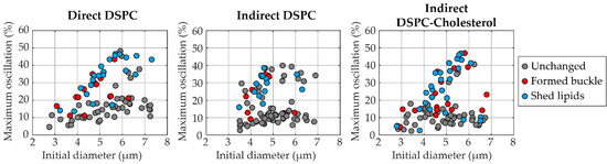 Finally, the correlation between LC domain size and oscillation amplitude was investigated for a limited size range of microbubbles, ruling out size-dependent differences in oscillation (Figure 12). Since the indirect DSPC-cholesterol microbubbles were lacking LC domains, they could not be scored for their LC domain size. Unscored microbubbles are shown as black dots in Figure 12. For the direct and indirect DSPC microbubbles of 4.5–6.0 µm (initial diameter), the lipid phase distribution was scored as “only large LC domains”, “large and small LC domains”, or “undefined” (Supplemental Figure S7). Both the direct (N = 11) and indirect (N = 14) DSPC microbubbles with large and small LC domains had a significantly higher oscillation amplitude than those with only large LC domains (direct: N = 4, indirect: N = 15).