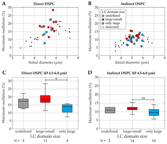 Maximum oscillation amplitude (%) at 50 kPa (over 1–4 MHz) as a function of initial diameter (µm) (A,B) for single direct DSPC (left) and indirect DSPC (right) microbubbles of 4.5–6.0 µm in diameter with LC domain size score as undefined (gray), large and small (red) or only large LC domains (blue), and as boxplot (C,D) representing the median and IQR with whiskers ranging from maximum to minimum. In A and B, the unscored microbubbles outside the 4.5–6.0 µm range are shown as black dots. * p < 0.05. ** p < 0.01.
