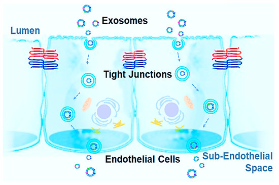 Recently, exosomes have been studied as a means of crossing the BBB and BCSFB [32,33], due to their natural homing specificity, immunogenicity [34], and prolonged half-life in the blood [35,36], heralding an endogenous approach to a complex puzzle. However, the role of exosomes in barrier integrity has still been largely unknown. Exosomes have been shown to carry cargo such as miR-3p across the BBB; alleviate neuroinflammation in hemorrhage regions in the brain [37]; and transport anticancer agents specifically targeting neurons [32], microglia, and oligodendrocytes [38]. They can also be uptaken by brain parenchyma and other cells in the brain [39]. Exosomal miRNAs and lncRNAs have been shown to inhibit uptake of glucose in brain astrocytes [40], mediating microglial cell polarization [41], but relatively few studies identify precise barrier mechanisms. One interesting study demonstrated that increased permeability of the BBB resulted in a greater influx of exosomes into brain microvascular endothelial cells (BMECs) [42,43] with migration through BMECs found primarily to be through the transcellular route rather than tight junctions involved in the paracellular pathway [42]. Exosomes also carry miR-132, which is established as a regulator of adherens-junction-related proteins, increasing BBB permeability and microhemorrhage events in brain microvasculature [44]. A recent study demonstrated that neural stem cell-derived exosomes can both initiate and repair BBB destruction, mitigating and reversing BBB-induced AD [45]. Such essential roles of exosomes in BBB integrity indicate an ever-increasing therapeutic value.