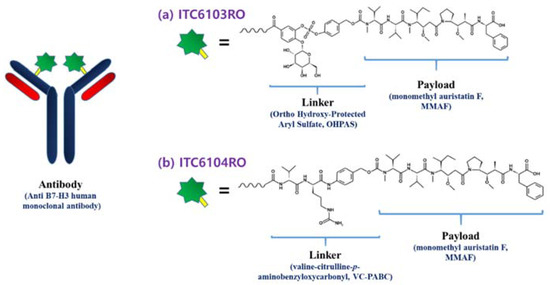 In this study, the linker stability of two ADCs with the OHPAS linker and the valine-citrulline-p-aminobenzyloxycarbonyl (VC-PABC) linker, which has been widely applied as SIG chemistry by the ADC research group [23], was evaluated using the immuno-affinity capture liquid chromatography-quadrupole time-of-flight mass spectrometric (LC-qTOF-MS) assays. The two ADCs are ITC6103RO (consisting of B7-H3-targeting human monoclonal antibody, OHPAS linker and monomethyl auristatin F (MMAF)) and ITC6104RO (consisting of B7-H3-targeting human monoclonal antibody, VC-PABC linker and MMAF), respectively, and are shown in Figure 1. For both ADCs, the linkers and payloads were site-specifically conjugated to the cysteine residues in the Fd’ region of monoclonal antibody by applying the THIOMAB™ antibody technology platform. Fd’ region corresponds to the antigen-binding fragment (Fab) region of the N-terminal heavy chain of antibody. Therefore, the DAR value of both ADCs was 2.