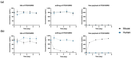 Time-concentration profiles of total antibody (tAb), antibody-conjugated drug (acDrug) and free payload for (a) ITC6103RO and (b) ITC6104RO from in vitro linker stability in mouse and IgG depleted human plasma.