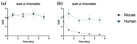 The DAR profile of ITC6104RO gradually decreased in mouse plasma, which was likely due to the instability of the VC-PABC linker by the carboxylesterase 1 (Ces1c) in mouse plasma, which was reported in previous references [32,33].