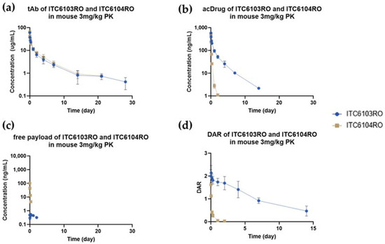 Pharmacokinetic (PK) profiles of (a) tAb, (b) acDrug, (c) free payload and the (d) calculated DAR profiles after intravenous administration of 3 mg/kg for ITC6103RO and ITC6104RO, respectively, in mice.