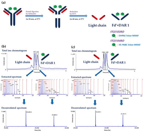 (a) Workflow of intact ADC mass analysis at subunit intact protein level by partial digestion and reduction, and the representative total ion chromatogram (TIC) with the extracted and the deconvoluted spectra of the quality control sample for (b) ITC6103RO and (c) ITC6104RO.