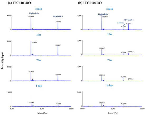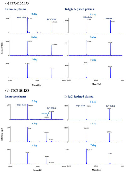 The deconvoluted spectra for (a) ITC6103RO and (b) ITC6104RO from the in vitro linker stability in mouse plasma and the IgG depleted human plasma samples.