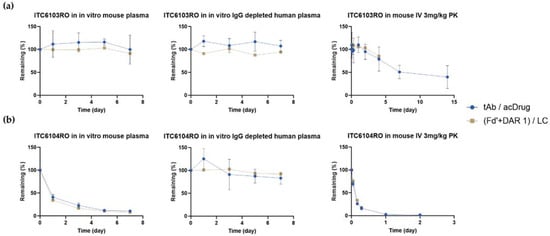 The in vitro linker stability plasma samples for ITC6103RO and ITC6104RO were analyzed by using the LC-qTOF-MS assays. The time-concentration profiles for tAb, acDrug and free payload of ITC6103RO and ITC6104RO were calculated and are shown in Figure 2.