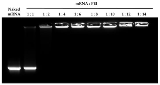 Electrophoretic analysis of the mRNA/PEI complexes. Each complex was applied to an agarose gel and subjected to electrophoresis. Retardation of the mRNA was visualized using GelRed.