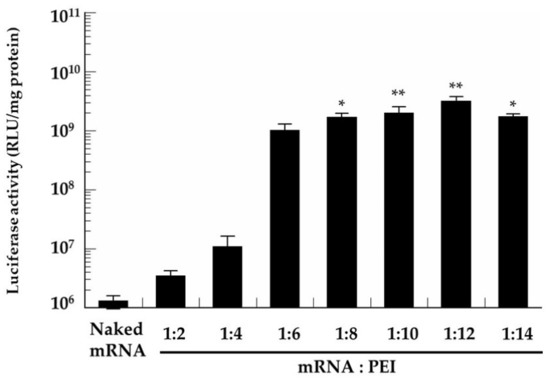 In vitro protein expression of the mRNA/PEI complexes at various charge ratios (1:2, 1:4, 1:6, 1:8, 1:10, 1:12, and 1:14) in B16 cells. B16 cells were incubated for 2 h with each complex. In vitro protein expression of the complexes was determined in the absence of fetal bovine serum. At 24 h following the addition of the complexes, luciferase activity in the cells was evaluated. Data represent the mean ± S.E. (n = 3). * p < 0.05, ** p < 0.01 vs. naked mRNA.