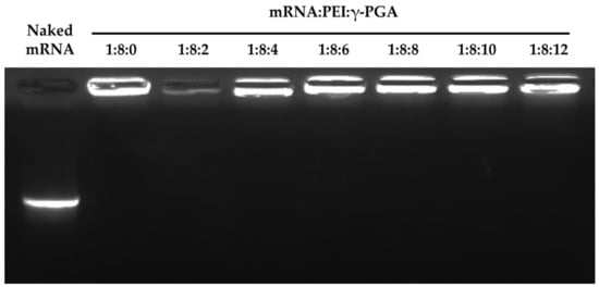 Electrophoretic analysis of the mRNA/PEI8/γ-PGA complexes. The complexes were applied to an agarose gel and subjected to electrophoresis. Retardation of the mRNA was visualized using GelRed.