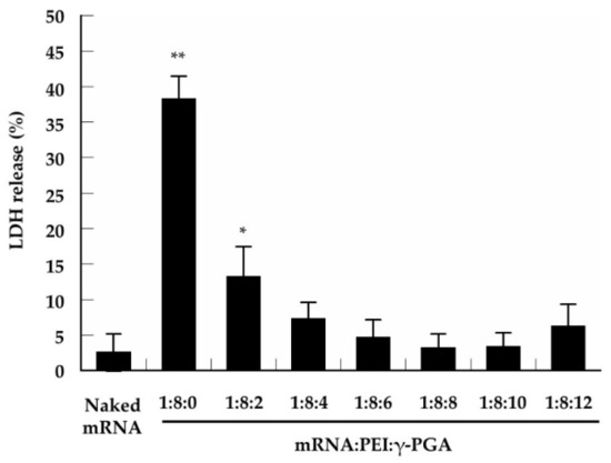 Cytotoxicity of the mRNA/PEI8 complex and the mRNA/PEI8/γ-PGA complexes at various charge ratios (1:8:2, 1:8:4, 1:8:6, 1:8:8, 1:8:10, and 1:8:12). Cytotoxicity was based on lactate dehydrogenase (LDH) release from B16 cells treated with each complex. Cells were incubated with the complexes for 2 h before the measurement of LDH in the culture medium. Data represent the mean ± S.E. (n = 8). * p < 0.05, ** p < 0.01 vs. naked mRNA.