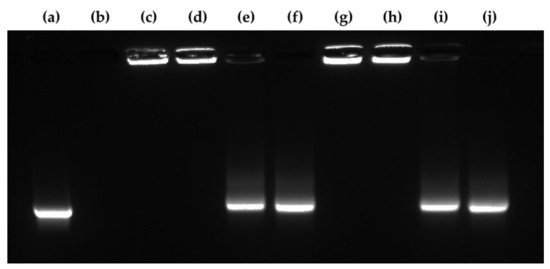 Electrophoretic analysis of naked mRNA and the mRNA/PEI8/γ-PGA12 complex following RNase treatment. The mRNA was visualized using GelRed. Heparin sulfate was added to the samples to evaluate the effect of complex dissociation. (a) Naked mRNA, (b) naked mRNA incubated with RNase, (c) mRNA/PEI8 complex, (d) mRNA/PEI8 complex incubated with RNase, (e) mRNA/PEI8 complex to which heparin was added, (f) mRNA/PEI8 complex incubated with RNase and to which heparin was added, (g) mRNA/PEI8/γ-PGA12 complex, (h) mRNA/PEI8/γ-PGA12 complex incubated with RNase, (i) mRNA/PEI8/γ-PGA12 complex to which heparin was added, (j) mRNA/PEI8γ-PGA12 complex incubated with RNase and to which heparin was added.