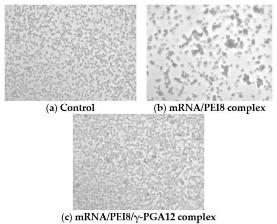 The agglutination activity of the mRNA/PEI8/γ-PGA12 complex was determined with erythrocytes and observed by microscopy (400× magnification), as shown in Figure 8. The cationic complex of mRNA/PEI8 was agglutinated with the erythrocytes, which have an anionic membrane surface. In contrast, the anionic complex of mRNA/PEI8/γ-PGA12 showed little agglutination of the erythrocytes.