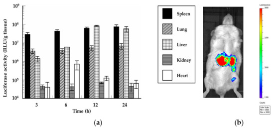The mice were administered with 400 µL of mRNA/PEI8/γ-PGA12 complex (containing 10, 20, 40, or 80 μg of mRNA) via intravenous injection. The mice were sacrificed, and the liver, kidney, spleen, heart, and lung were dissected at 3, 6, 12, and 24 h after the injection. Luciferase activities in the five organs (liver, kidney, spleen, heart, and lung) were measured according to the methods described in a previous report [19]. Luciferase activity was indicated as the relative light units (RLU) per gram of tissue.
