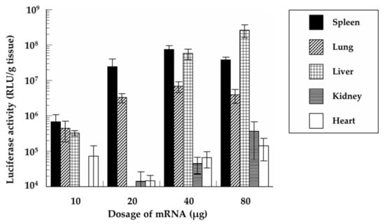 Using a similar approach, the luciferase activities of the five organs were determined at 24 h after the intravenous administration of various doses of the mRNA/PEI8/γ-PGA12 complex (Figure 10). The low dose (10 µg mRNA) showed little protein expression in any of the tissues. Comparably high luciferase activities in the spleen were observed for doses of 20, 40, and 80 µg mRNA. The highest activity in the lung was observed at the dose of 40 µg mRNA. Furthermore, the luciferase activity in the liver increased with increasing doses of mRNA. There was little luciferase activity in the kidney or heart even in the presence of high doses.