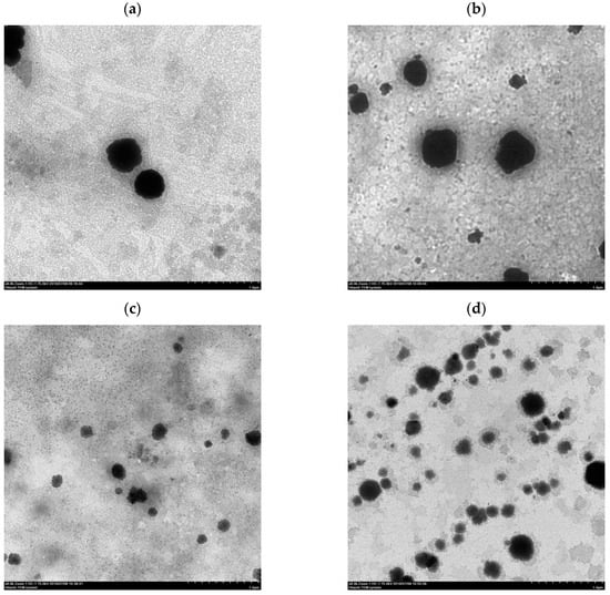 After the ethanol injection method, the liposomes were destroyed by homogenization through stirring, ultrasonic oscillation, or HPP to form a dispersed suspension of phospholipid fragments that were then reassembled to form liposomes. The morphology of the liposomes prepared according to different homogenization methods is shown in Figure 2. TEM images (Figure 2c,d) revealed that the particle size of the liposomes by probe ultrasonication and HPP at 300 MPa was from 100 to 200 μm and from 150 to 300 μm, respectively. The lipid fragments and lipid granules were formed under different homogenization methods, and the particle size of the liposomes followed the order of magnet stirring > ultrasonic bath > HPP at 300 MPa > probe ultrasonication.
