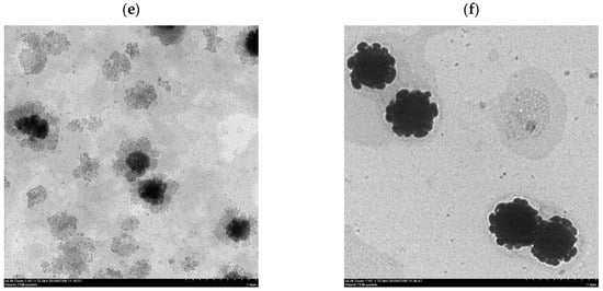 Transmission electron microscopy (TEM) images of Clitoria ternatea petal (CTP) liposomes prepared by different homogenization types. (a) Magnet stirring; (b) Ultrasonic bath; (c) Probe ultrasonication; (d) HPP at 300 MPa; (e) HPP at 400 MPa; (f) HPP at 600 MPa.