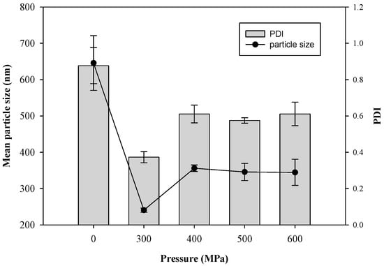 Pressure is an important processing parameter in HPP. Thus, the effects of hydrostatic pressure (from 300 MPa to 600 MPa) on the particle size of CTP liposomes by the HPP treatment were investigated, as shown in Figure 3. The mean particle size of liposomes (blank) without HPP treatment (0 MPa) was 645.8 ± 75.2 nm. The results demonstrated that the liposomes resulting from the HPP treatment at 300 MPa by a pressurization and depressurization process had a significantly decreased mean particle size compared to those created without the HPP treatment because of the dispersion and destruction effect via the fast-adiabatic expansion of water. The double-layered phospholipids were compressed and packed tightly by the hydrostatic pressure during pressurization processing. During decompression, the structure of the phospholipid bilayer was lost and transient phospholipid fragments were formed due to the fast-adiabatic expansion of water. Lastly, the transient phospholipid fragments self-assembled rapidly in solutions to form liposomes with smaller particle sizes.