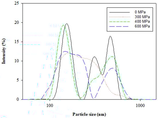The polydispersity index (PDI) indicates the size uniformity of a liposome, which is related to the stability of the colloidal system. The effects of pressures from 300 MPa to 600 MPa by HPP on the polydispersity PDI and the size distribution curve of the liposomes are shown in Figure 2 and Figure 3, respectively. The PDI (0.37 ± 0.03) with the HPP treatment at 300 MPa was smaller than that (0.88 ± 0.10) without the HPP treatment. The results of the average particle size and PDI in this study revealed that the HPP treatment could reduce the particle size and enhance the uniformity of the liposomes. The PDI, as well as the average particle size, showed a similar trend from 300 MPa to 600 MPa. The results inferred that excessive compression possibly caused the aggregation of liposomes and the bimodal size distribution (Figure 4) as a certain pressure was exceeded. The previous research concluded that the successive compression above a certain pressure caused the aggregation of surfactants in aqueous solutions []. In a previous study of PEG-induced fusion, osmotic mismatches have been used to enhance aggregation, as negative osmotic pressure (when the solution inside liposomes is hypotonic compared to the solution around liposomes, normally associated with shrinkage of liposomes) promoted aggregation of LUVs in the presence of PEG []. From the size distribution curve (Figure 4), it was found that the liposomes prepared by the HPP method under 300 MPa of pressure had a left-shifted particle size distribution, which reduced the mean particle size. The results also referred to the display of the unimodal distribution as a whole in drug delivery systems.