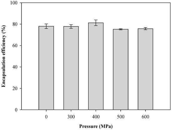 Liposomes are nano-scale spheroid vesicles composed of one or multiple lipid bilayer(s) enclosing an aqueous core. As bilayer structures, liposomes in aqueous solutions can encapsulate hydrophilic substances in the aqueous compartment, while hydrophobic substances can be accommodated in the lipid phase. The effects of hydrostatic pressure on the encapsulation efficiency of CTP liposomes by HPP are shown in Figure 5. The encapsulation efficiency of the unpressurized sample was 78.03 ± 2.14%. The homogenization, either with or without HPP, had no significant impact on the encapsulation efficiency of the CTP liposomes. However, HPP homogenization was found to effectively reduce the particle size of the liposomes and arrived at more than 75% encapsulation efficiency.