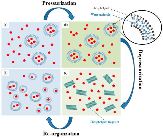 - During decompression, the structure of the phospholipid bilayer was lost and pores were formed due to the fast adiabatic expansion of water. Water molecules rapidly escaped from the pores and break up the structure of the phospholipid bilayer to form transient phospholipid fragments. In microbial cells and spores, fast decompressions may lead to higher inactivation due to the fast-adiabatic expansion of water [,]. The previous studies proposed that the aqueous phase was first mixed with the phospholipid, supercritical fluid, and co-solvent mixture and later rapidly decompressed by spraying through a nozzle []. The size of liposomes obtained was in the range of 0.2–4 m [].