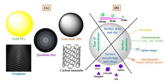 (A) Different types of nanomedicine utilized in cancer diagnosis and therapy; (B) various physicochemical characteristics of nanomedicine influencing its biopharmaceutical performance.