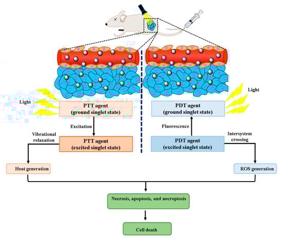 Illustration depicts the utilization of cancer nanomedicine in photothermal therapy (PTT) and photodynamic therapy (PDT) leads to cancer cell death.