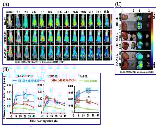 Illustration depicts in vivo evaluation of near-infrared fluorescent dye-loaded liposomal nanomedicine as cancer diagnostics for the image-guided nuclear delivery of the encapsulated dye (A) in vivo imaging of delivery of NIR-fluorescence dye (DY676-COOH) in mice bearing FAP-expressing fibrosarcoma HT1080-hFAP [] and FAP-expressing human melanoma MDA-MB435S [] after i.v. injection for 0–48 h. (B) Semiquantitative analysis of fluorescence intensities of a region of interest on respective tumors or background (thigh region) at a given time point. (C) Photograph and NIR-fluorescence images of tumor tissue excised after the 48 h of liposomal nanomedicine (monospecific and bispecific) administration indicating intense liposomal fluorescence in case of mice bearing FAP-expressing fibrosarcoma HT1080-hFAP. Reproduced from [], MDPI, 2020. Note: Three groups of tumor-bearing mice were treated with two types of monospecific liposome (HER2-IL and FAP-IL) and one Bispecific liposome (Bi-FAP/HER2-IL). * significant compared to control, ** highly significant compared to control.