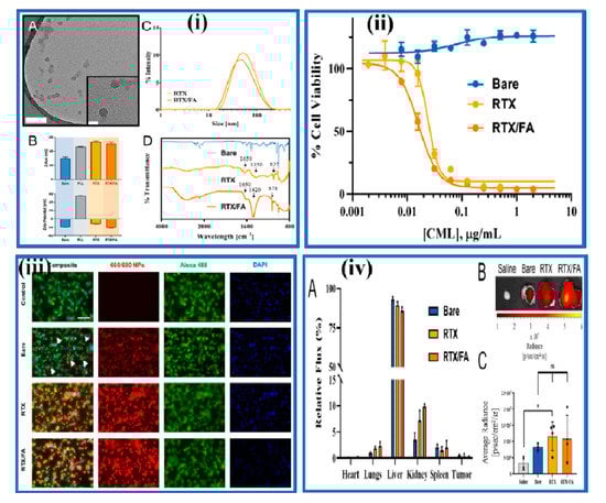 Illustration depicts the formulation design, in vitro and in vivo evaluation of folate-modified raltitrexed-loaded multifunctional nanoparticles (RTX/FA NP) as cancer theranostics. (i) Physical characterization of raltitrexed (RTX) and RTX/FA NP formulations; [A] TEM images, [B] mean size and zeta-potential, [C] intensity-derived size distribution, [D] IR spectra. (ii) Cell viability assay of CT26 cancer cells after 72 h treatment. (iii) In vitro cellular uptake of developed nanomedicine through fluorescence microscopy. (iv) Biodistribution of NP formulations injected into mice bearing CT26 tumors; [A] comparative profile of mean relative flux in various organ from different treatment group, [B] comparative profile of signal intensity of tumors from different treatment group, [C] comparative profile of mean average radiance of tumors from the different treatment group. Reproduced from [], MDPI, 2020. * significant compared to control.