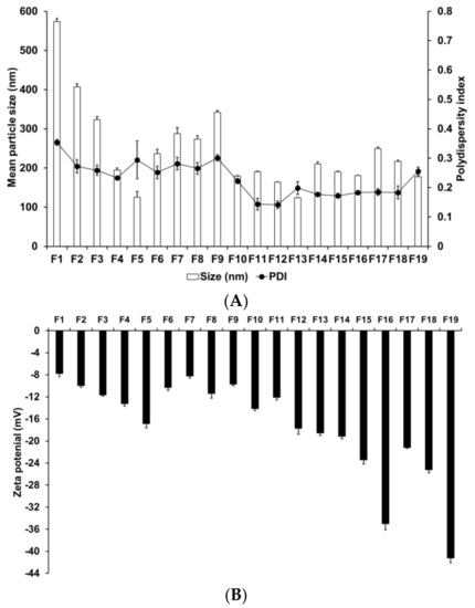 We evaluated the effects of various materials and AD, lipid, and surfactant compositions on the formation of nanoparticles. Zeta potential is an important parameter that provides information regarding the storage stability of nanoparticles [62]. High zeta potential ensures high energy barrier and favors high storage stability, whereas low zeta potential implies easy release the encapsulated drugs [63]. Therefore, a moderated zeta potential plays an important role in a balance between storage stability and drug release. Figure 1 presents the particle size, PDI, and zeta potential of SLNs F1 to F5, which were prepared using different solid lipids. Among these lipids, those with a longer carbon chain tended to produce smaller and more homogeneous particles; additionally, these particles were more stable, as indicated by their higher zeta potential. This suggests that lipids with longer carbon chains present a greater inherent negative charge from the carboxyl end group of saturated fatty acids [64]. The higher negative charge on the particle surface leads to increased repulsion among the particles; therefore, the tendency for aggregation is lower in these particles than in those with a lower negative charge.