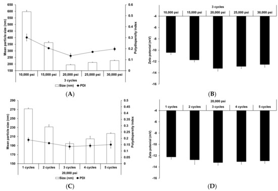 The effect of HPH parameters (homogenization pressure and number of homogenization cycles) was also evaluated. HPH has been widely used to prepare nanoparticles and nano-emulsions [66,67]. Reduction of particle size improves the shelf life of such products by reducing aggregation and creaming rate [68]. Figure 2 presents the particle size, PDI, and zeta potential of SLNs prepared using different HPH parameters. Upon increasing the homogenization pressure and number of homogenization cycles to 20,000 psi and 3, respectively, the particle size and PDI of SLNs decreased, followed by a slight increase, while the zeta potential increased, followed by a slight decrease. This suggests that although the HPH process contributed to particle size reduction and improvement in particle stability, over-processes, such as excessive pressure and cycles, lead to reduction in process efficiency. Particle size and size distribution were significantly affected by HPH pressure. Therefore, excessive pressure may lead to droplets cracking, as reported in other studies [69,70]. In case of excessive cycles, increasing number of homogenization cycles lead to formation of rapidly aggregating droplets during HPH [71,72].