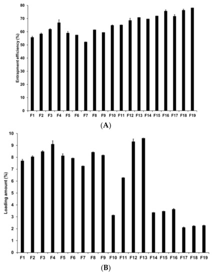 Considering the effects of the concentrations of the drug, lipid, and lipophilic surfactant, the overall percentages of LE and LA of F4 and F10 to F19 were 64.85–78.12% and 2.11–9.61%, respectively. An increase in drug, lipid, and surfactant concentrations increased the LE of AD in SLNs. However, although the LA of AD increased with an increase in the drug and surfactant concentrations, it decreased with an increase in the lipid concentration. According to HLB scale, primary W1/O emulsions prepared at SA-to-SP 80 ratios of 1:0.04, 1:0.2, and 1:1 exhibited HLB values of 5.93, 5.72, and 5.15 respectively. Among the W1/O/W2 emulsions, F14 to F19 had HLB values ranging from 9.13 to 14.94, which are part of O/W emulsifier, while that of the formulations F4, F12, and F13 ranged from 17.08 to 21.11, which are part of solubilizer or hydrotrope [75]. When preparing the primary W1/O and W1/O/W2 emulsions, the emulsion with higher lipophilicity exhibited higher LE and LA. However, the LA decreased with an increase in the SA concentration. Therefore, although AD is a hydrophilic drug (log P = −1.05), an emulsion with high lipophilicity can stably encapsulate hydrophilic drugs into lipophilic materials [76,77].