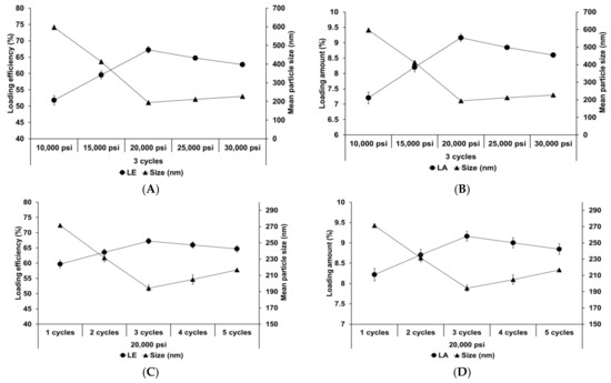 Figure 4 shows the effect of different homogenization pressures and number of homogenization cycles on SLNs. Both LE and LA increased with an increase in both the homogenization pressure and number of homogenization cycles to 20,000 psi and 3 cycles, respectively, followed by a slight decrease. The particle size showed an inverse relationship with the loading capacity. This suggests that the reduction in particle size induces an increase in the number of particles. Therefore, although the drug-loading capacity of a lipid particle decreases due to reduction of the lipid matrix, the drug-loading capacity for the entire SLN increases. Considering the effects of over processes, the induction of droplet cracking [69,70] and rapid droplet aggregation [71,72] leads to a decrease in the loading capacity. Indeed, Yang et al. reported similar results that the loading capacity of emulsions increased with an increase in the homogenization pressure and number of homogenization cycles up to 100 MPa and 4 cycles, respectively, and subsequently decreased with further increase in these parameters [71].