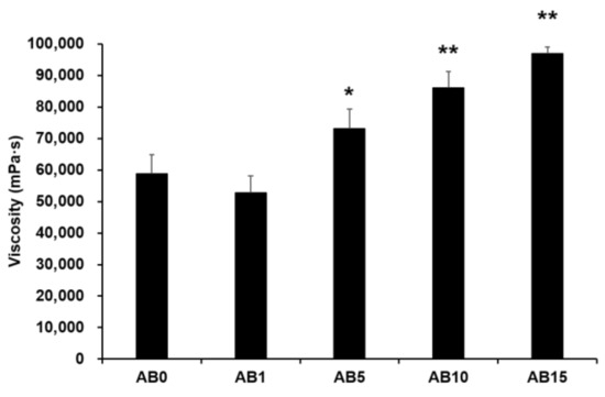 Viscosity was measured to evaluate the possible effect of variations in the formulation of elastic artificial skin with/without AD-loaded SLNs. Spreadability plays an important role in topical formulations. When applying elastic artificial skin to the desired skin area, good spreadability is desirable [78]. However, to reduce the cross-link reaction time between components A and B when synthesizing elastic artificial skin, an increase in the viscosity profiles of formulations is beneficial. The viscosity profiles of elastic artificial skin were evaluated using shear experiments. Figure 5 shows results regarding the viscosity of elastic artificial skin with/without AD-loaded SLNs. An increase in the proportion of SLNs in the elastic artificial skin significantly increased the viscosity. The viscosity value of the formulation containing SLN 1% was lower compared to that without SLN but the difference was not statistically significant. Reportedly, an increase in the composition of SLN gradually increased the viscosity of the elastic artificial skin due to an increase in the oil phase in SLNs [77]. In addition, among the evaluated elastic artificial skin formulations, AB5, AB10, and AB15 showed a significant increase in viscosity at p < 0.05, p < 0.01, and p < 0.01, respectively.