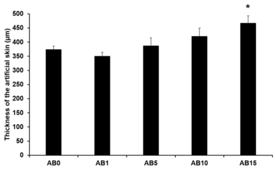 Figure 6 presents the thickness of the elastic artificial skin with/without AD-loaded SLNs at different concentrations. The thickness tended to gradually increase with increasing SLN concentration exceeding 5%. The main reason for this might be that the increased concentration of SLN in the elastic artificial skin increased the viscosities. A higher viscosity of the elastic artificial skin compositions could demonstrate stronger resistance against the spread forces applied to the compositions when the artificial skins were synthesized. Therefore, the thickness of the elastic artificial skin was increased when the viscosity of the formulations was increased [79,80]. The difference in thickness of AB0 and of AB15 exhibited a statistical significance of p < 0.05.