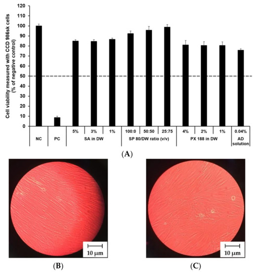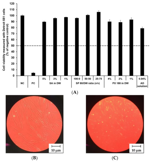 To evaluate skin irritation, we investigated the cytotoxic effects of each component of the nanoparticles in human fibroblast cell lines. Two fibroblast cell lines (CCD 986sk and Detroit 551) were seeded into 96-well plates at 1 × 104–1 × 106 cells/well, respectively; the number of cells were calculated using the hemocytometer method. Prior to each cytotoxicity experiment, the cells were incubated to adhere for 24 h at 37 ± 0.5 °C in a humidified atmosphere with 5% CO2. Then, the incubated cells were exposed to the samples at 20 µL/well for 15 min at room temperature. The negative control (NC) and positive control (PC) used were DPBS and 5% SDS solution, respectively, according to the method described by Alépée et al. [55]. The exposed cells were subsequently rinsed with sterile PBS. The treated cells were incubated for 24 h at 37 ± 0.5 °C, 5% CO2 in 200 µL of growth medium for the MTT reduction experiment, as described in Section 2.9.3.