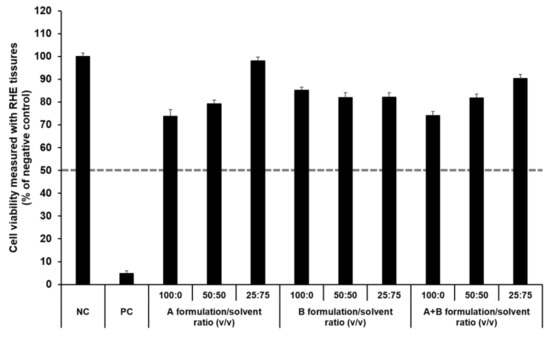 Cytotoxicity was determined by measuring the dehydrogenase activity of viable keratinocytes following a 42 h post-incubation. The activity was determined after incorporation of MTT, as described previously [55]. Each cell line and RHE tissue was treated with 1 mg/mL MTT solution for 3 h. The blue formazan crystals were subsequently extracted from the cells and tissues using isopropanol for at least 2 h. The concentration of formazan was measured by determining the optical density (OD) at 570 nm using a spectrophotometer (FlexStation 3, Molecular Devices, California, CA, USA).