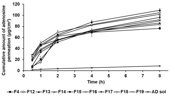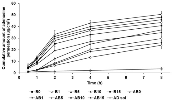 Despite its promising pharmacological effects, AD exhibits poor permeation into the skin owing to its hydrophilic property [10,11]. Various approaches have been reported to improve permeation of hydrophilic drugs into skin such as inclusion of chemical enhancers (such as ethanol and dimethyl sulfoxide) [12,13], physical methods utilizing an instrument (such as electroporation and iontophoresis) [14,15,16], and optimized formulations (such as polymer particles, emulsion, and lipid-based particles) [17,18,19]. However, considering safety issues associated with the disruption of the skin barrier and the investment in specialized facilities, pharmaceutical alternatives are necessary as an alternative to complicated technologies [20,21,22,23].