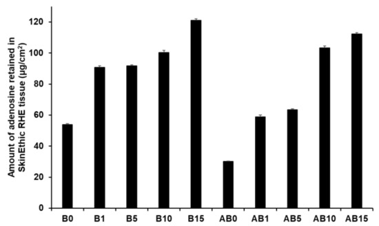 Following in vitro permeation study, the amount of AD retained in the SkinEthic RHE tissues was investigated using HPLC. Following the skin permeation experiments, the tissues were transferred to a glass vial (5 mL) and mixed with 2 mL of maintenance media. Then the tissue suspension was homogenized using high speed homogenizer at 10,000 rpm. Aliquots of 1 mL were withdrawn from the vial, passed through 0.45-μm PTFE membrane filters, and immediately analyzed for AD using HPLC, as described in Section 2.8.