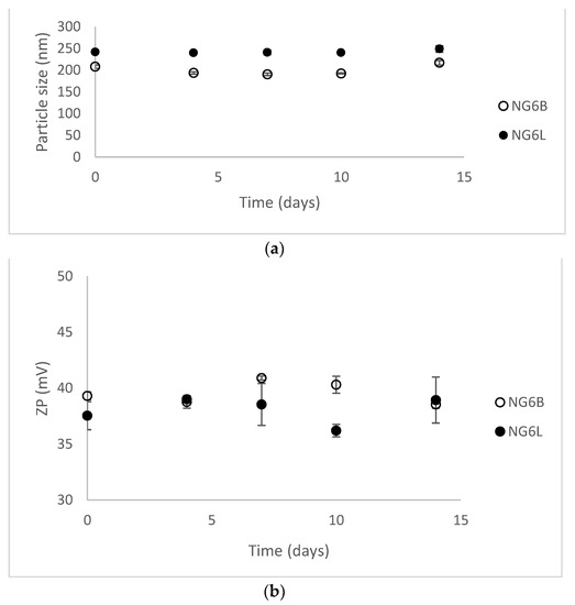 Nanogels were stored at 4 °C for a preliminary evaluation of short-term stability by monitoring dimensions and ZP values for two weeks (results shown in Figure 2). NG6B and NG6L resulted as stable (PDI values lower than 0.3 at each time point), presumably thanks to the highly positive ZP values of the formulations responsible for hindering nanogel aggregation in the solution.