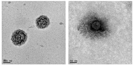 Morphological analysis of selected nanogels was performed by using a high-resolution transmission electron microscope (JEM-1011, JEOL USA Inc., Peabody, MA, USA). Briefly, nanogel formulations were placed on carbon-coated grids and 5 μL of 2% w/v phosphotungstic acid was added for 60 s. After washing with pure water, the excess was carefully removed and samples dried before observation.
