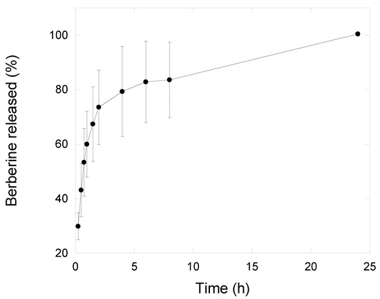 Berberine release profile from nanogels (NG6L formulation) recorded in saline solution using dialysis membranes setup (n = 3, mean ± sd).