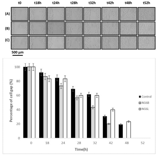 In vitro wound-healing assay photographs at 0, 18, 24, 28, 42, 48 and 52 h after incubation with the samples (control row A, NG6B row B, NG6L row C) at 37 °C in 5% CO2 and 95% relative humidity, and percentages of cell gap as a function of time.