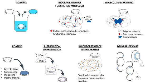 In the following section, the various strategies that have been developed for loading drugs in therapeutic lenses are summarized. In Figure 2, a schematic description of these methods is presented.