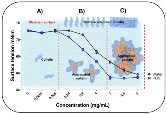 Measurement of CST surface tension was carried out using a surface tension meter (OCA15EC Dataphysics Instruments, Filderstadt, Germany) with the appropriate driver software (version 4.5.14 SCA22). The capture of the suspended droplet was recorded using an IDS video camera [25] and the solutions were prepared using dilutions from 5 mg/mL of reconstituted colistin with ultrapure water and phosphate-buffered saline at pH 7.2 (PBS, 138 mM NaCl, 3 mM KCl, 1.5 mM NaH2PO4, 8.1 mM Na2HPO4).