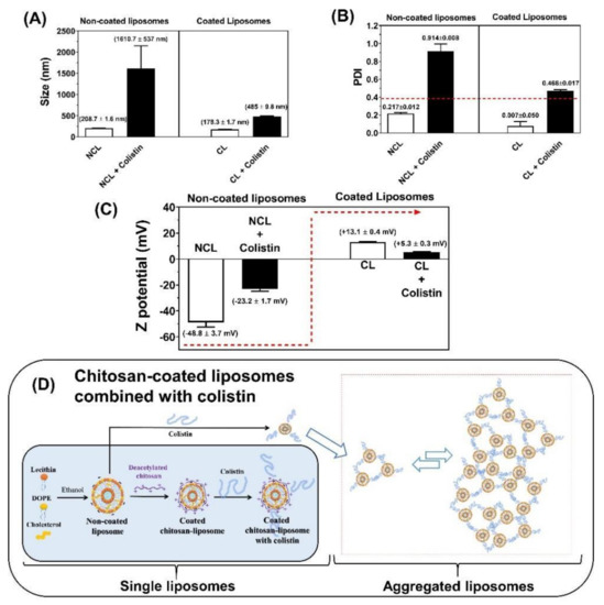 Physicochemical characterization of uncoated and chitosan-coated liposomes in the presence and absence of CST. (A) Particle size, (B) Polydispersity index-PDI, (C) Zeta potential, (D) Schematic representation of the liposomal coating process and its interaction with CST. NCL—Non-coated liposomes; CL—coated liposomes.
