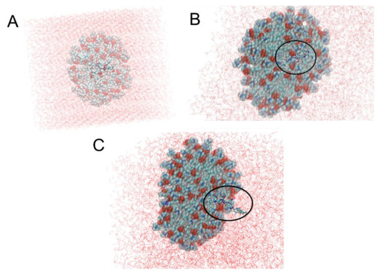 After 7 ns, most of the CST comes out of the DPC micelle due to its strong hydrogen bond interaction with the water molecules surrounding the micelle. CST appears at 2 ns (Figure 3B) and is even more visible at 7 ns (Figure 3C). This is consistent with the results shown in Figure 2A,B since it reveals that CST is positioned on the external surface of nanoliposomes, thereby increasing the size and the Z potential value. Although the DPC headgroup carries a highly electronegative phosphate center comprised of four strong hydrogen-bond acceptor oxygen atoms [20], the binding between CST and DPC micelles is reduced.