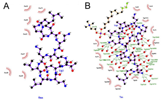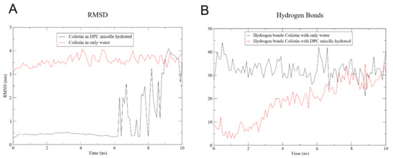 The software VMD (Visual Molecular Dynamics, University of Illinois, Chicago, IL, USA) was used to visualize the simulation [33]. In order to determine the root mean square deviation (RMSD) and the hydrogen bond formation between colistin and the model system, a simulation analysis was performed using gromacs. Finally, the interactions were manually analyzed using Discovery Studio Visualizer version Client 2020 (https://discover.3ds.com/discovery-studio-visualizer-download) and Ligplot+ [34].