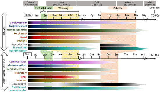 In order to assess the feasibility of the neonatal and juvenile pig as models for pediatric drug development, an in-depth characterization of this model must be carried out in the first place, followed by a comparison with the anatomical, physiological and ADME characteristics in the corresponding pediatric age groups. Our group has already reported on the age-related maturation of organ weights in the developing Göttingen Minipig in an effort to further develop a PBPK model [35], but more data are needed. The implementation of this model would benefit from data on microsomal protein per gram of liver and abundance on drug metabolizing enzymes during development, or from a better understanding of pig orthologues for human cytochrome P450 (CYP) enzymes. For the developing domestic pig, the anatomy, physiology and the absorption, distribution and excretion of drugs have been reviewed by Gasthuys et al. [40]. As some of the above data are publicly accessible in the ICH S11 guidelines on nonclinical safety testing in support of the development of pediatric pharmaceuticals [36], we will only highlight some key points in this review. The EMA has established different age categories within the pediatric population [41], and many similarities between human and Göttingen Minipig organ development (as the reference breed used in the pharmaceutical industry [42] were reported in the ICH S11 guidelines [36].