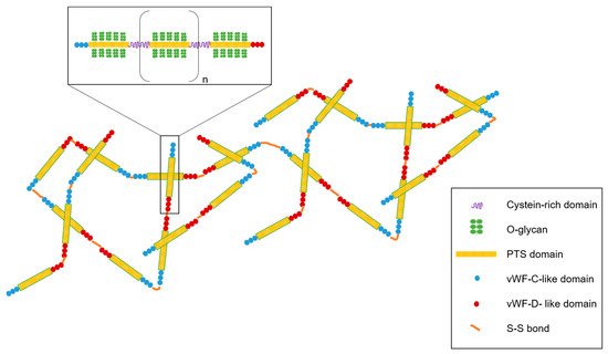 General structure of mucins, the main constituent of mucus. Mucin contains the PTS (proline, threonine, and serine) domain and supporting O-glycan. The PTS domain is interspaced with cysteine-rich domains. Mucin glycopolymer ends with the von Willebrand factor (vWF) domain in N- and C-terminal regions. Mucin polymerized via disulfide bonds and mucin polymers interact with each other via hydrophobic and electrostatic interactions.